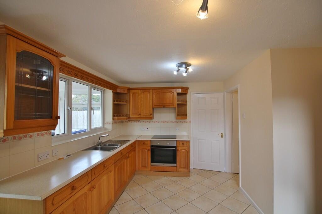 KITCHEN/BREAKFAST ROOM 14′ 10″ x 9′ 1″ (4.52m x 2.77m) Fitted with good range of cabinets, integrated oven, hob and extractor hood, door leading to Conservatory and door leading out to side of property Â