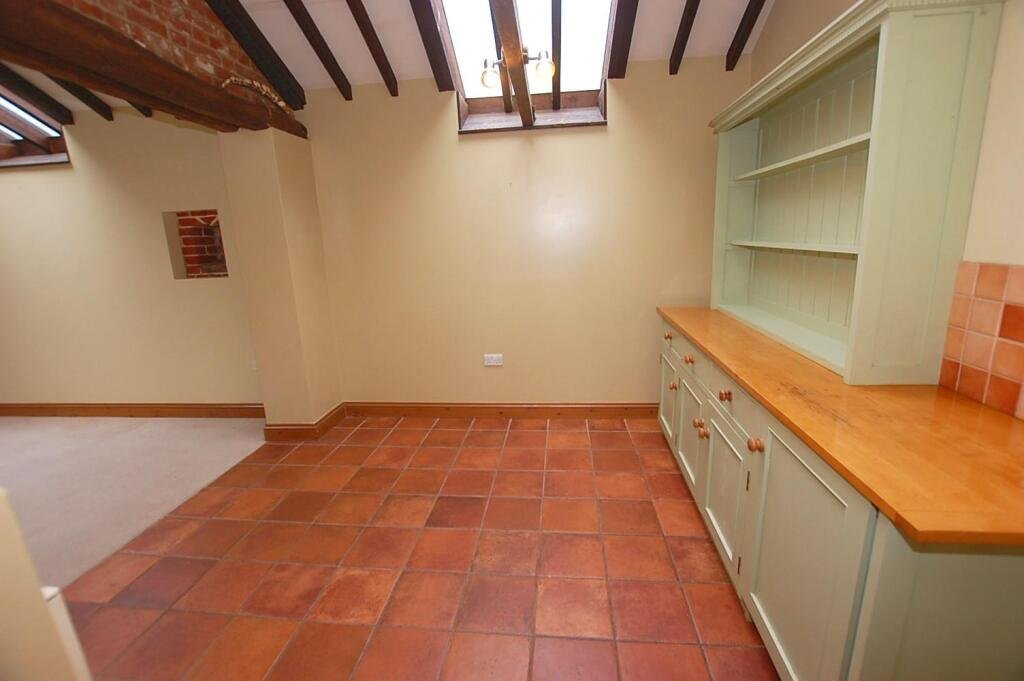 Kitchen – 4.51m x 1.87m – Bespoke farmhouse style kitchen with granite effect work surface and butler sink. Tiled floor. Beamed ceiling.