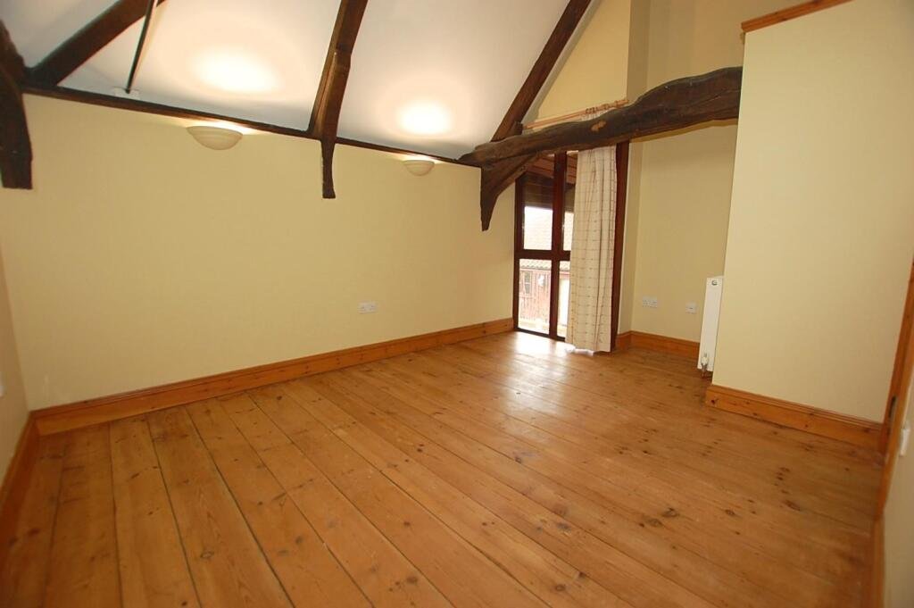 Bedroom One – 3.84m x 3.38m – Timber floor. Vaulted and beamed ceiling.