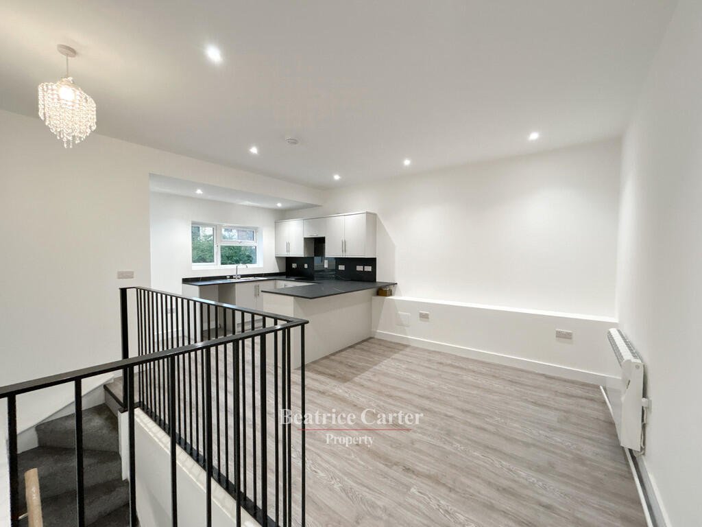 The open-plan living space features stylish flooring, recessed lighting, and a sleek fitted kitchen with integrated appliances and striking Venetian-style worktops. The black stair balustrade adds a bold architectural feature, enhancing the modern aesthetic.