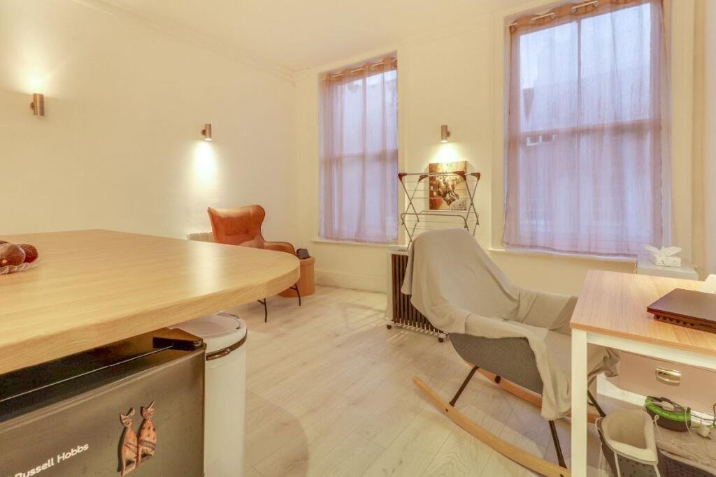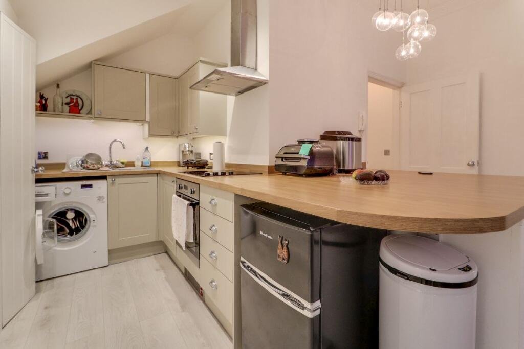 The accommodation comprises an entrance hallway leading into a bright open-plan living, dining, and kitchen space designed for modern town-centre living. The property further benefits from a comfortable double bedroom and a bathroom fitted with a shower over the bath.