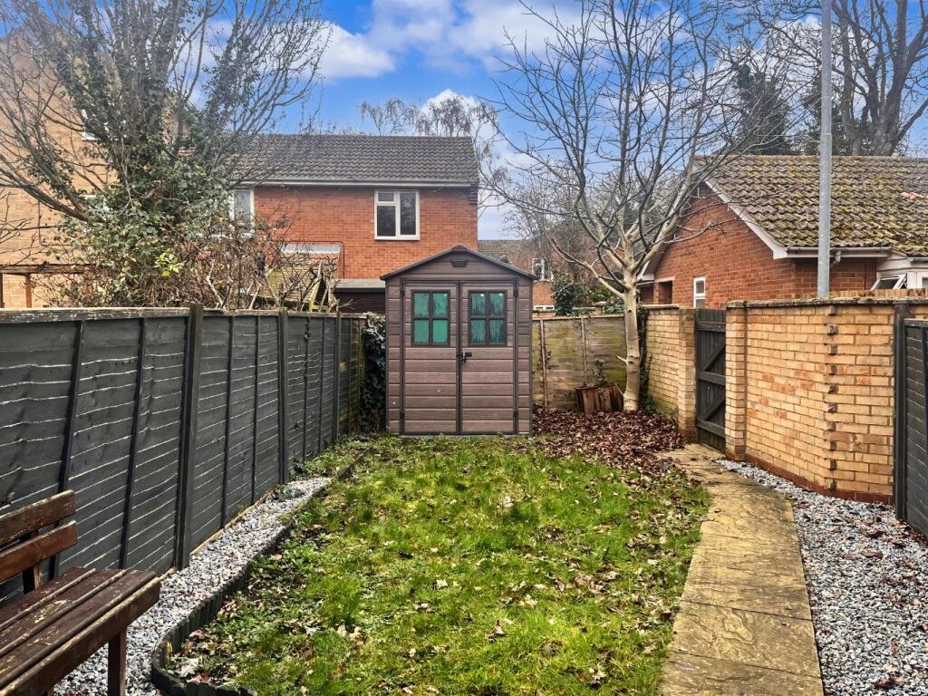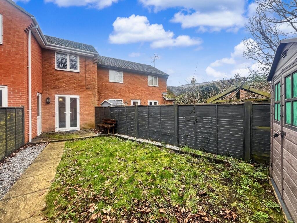 Rear Garden: Gated Side Access, Laid to Lawn with Decked Area. Shed.