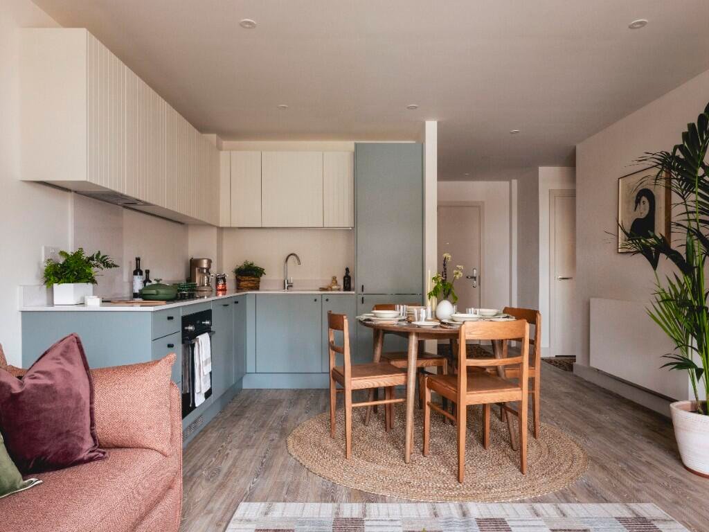 A beautifully designed, brand new furnished apartment in the heart of Eddington, Cambridge. Part of Present Made, a new neighbourhood designed to offer the ultimate rental experience. Your home comes with two spacious double bedrooms, one en-suite and one family bathroom, a fully fitted kitchen and open plan dining and living area. Floor-to-ceiling glass doors let in lots of natural light and lead out to your own private balcony. The fittings and finishes are modern and high-spec – enjoy integrated Bosch appliances, built-in storage and waterfall showers.