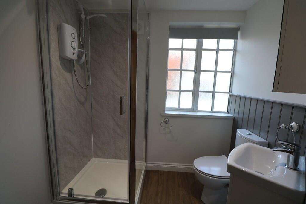SHOWER ROOM 7′ 2″ x 6′ 5″ (2.18m x 1.96m) MAX Wood effect lino flooring, shower cubicle with electric Triton shower, mermaid board surround, white ceramic sink and toilet, mirrored bathroom cabinet, heated towel rail, extractor fan, side aspect frosted window with blind.Â